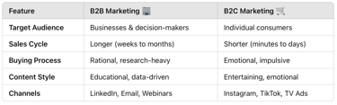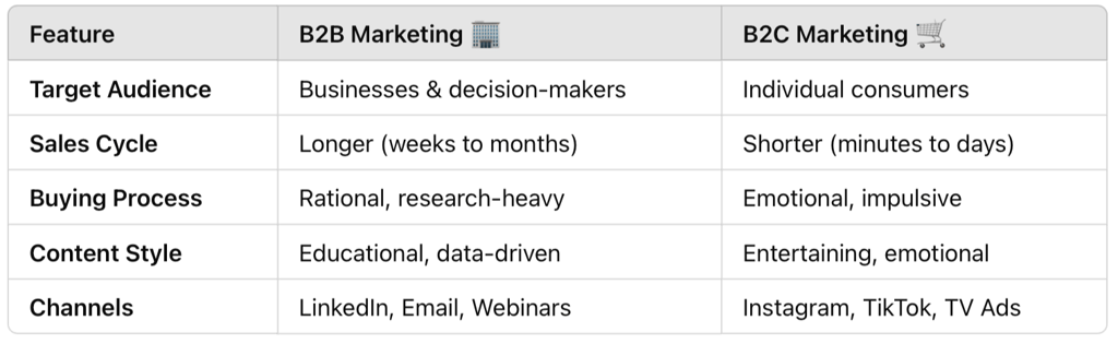 B2B marketing is all about logic, long sales cycles, and multiple decision-makers (CFOs, procurement teams, and IT managers). Unlike B2C, where impulse buys and emotions drive purchases, B2B buyers need proof, trust, and a lot of nurturing before making a decision.